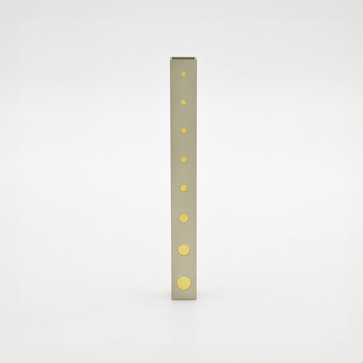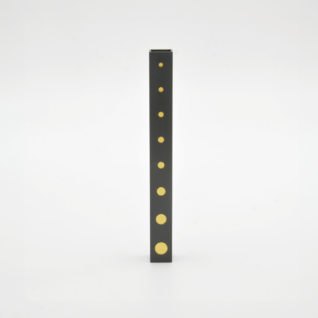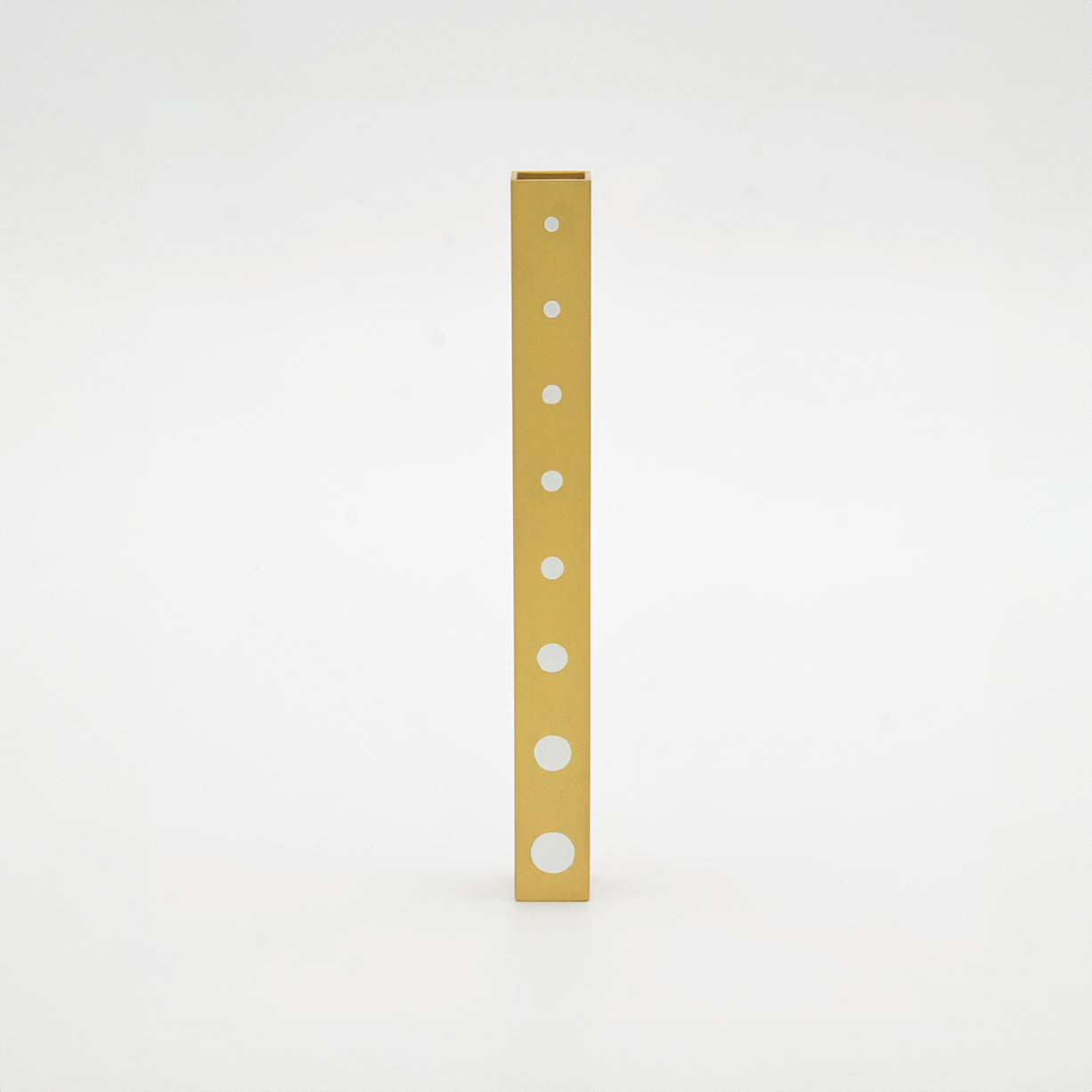 広がる波紋のように連なる円が、水面を跳ねる軽やかさを想起させる一輪挿し。箔や色のアクセントが光を捉え、遊び心のあるリズムを空間に生み出します。